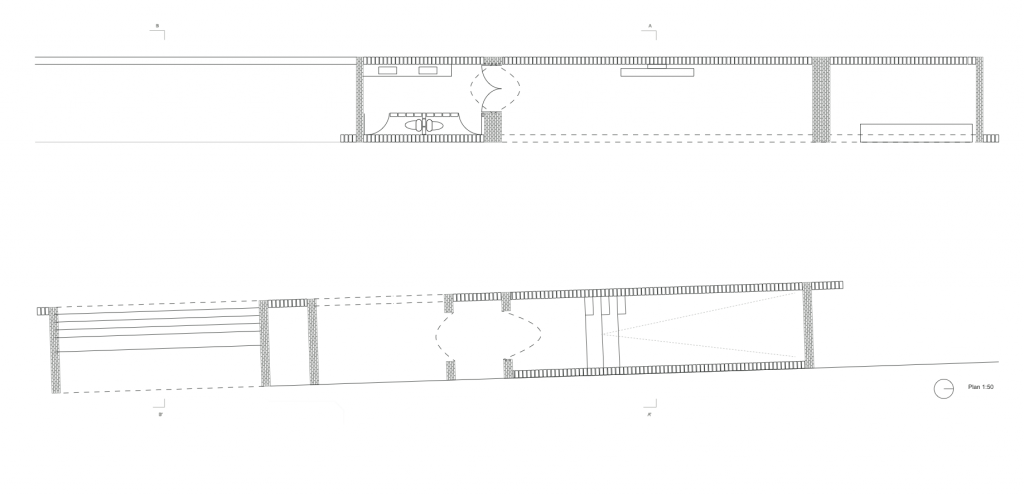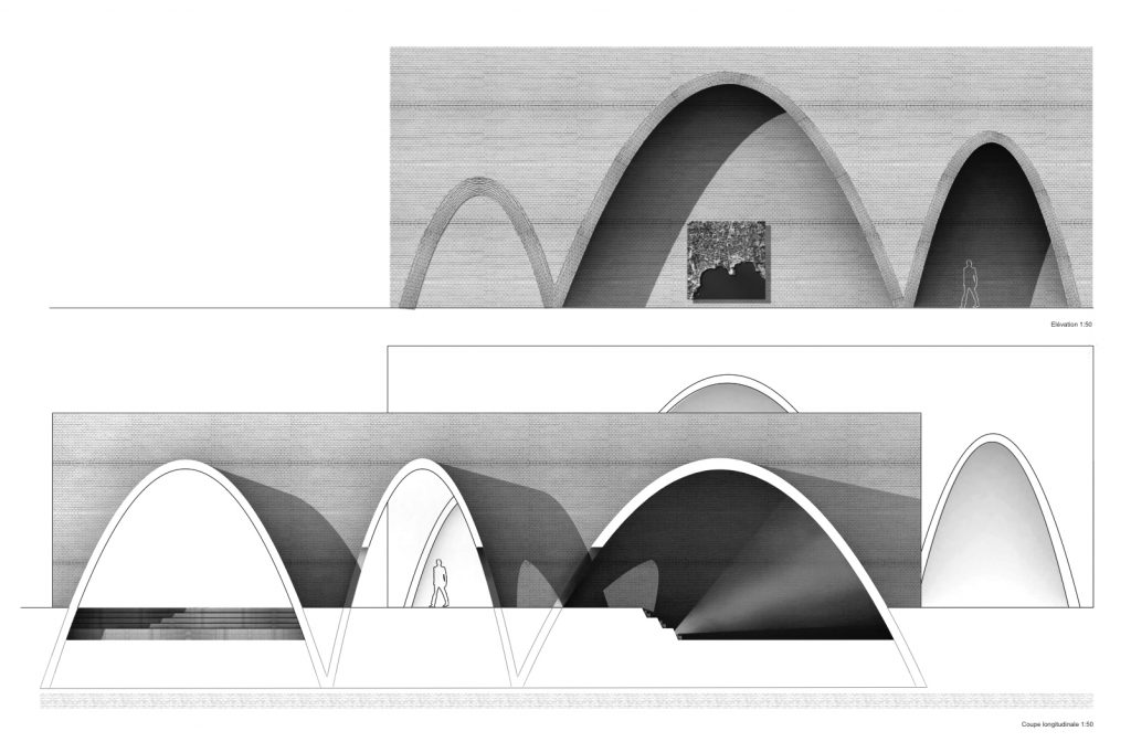 Conception d’un pavillon dans le contexte du parc Ciani à Lugano (Suisse). Situé à une entrée étroite du parc, le pavillon doit comprendre un point d’information et de projection sur l’évolution urbaine de Lugano. C’est un espace de transition entre la ville, la rivière et le parc. Les deux murs en brique encadrent l’entrée du parc et offrent à chaque arcade une diversité d’interaction avec le visiteur entre contemplation, exposition et érudition.